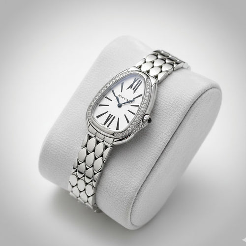 fashionable luxury quartz wristwatch designed for women, featuring a distinctive square case and a sleek silver-tone metal alloy strap.