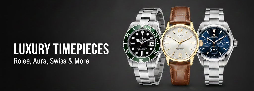 Rolex Datejust style watch featuring a black dial with stone markers and a stainless steel bracelet.